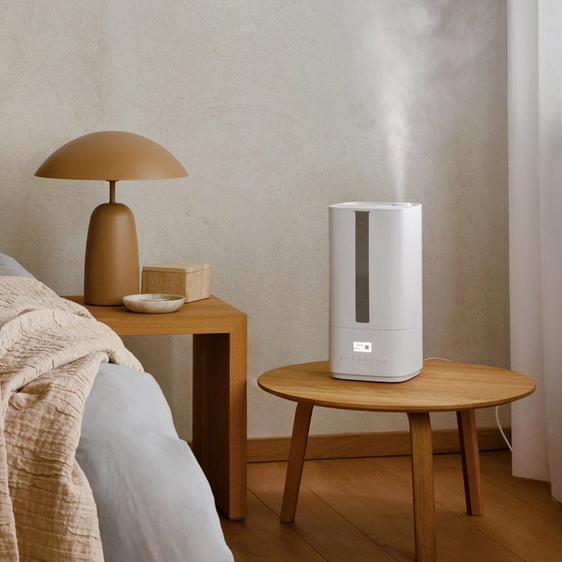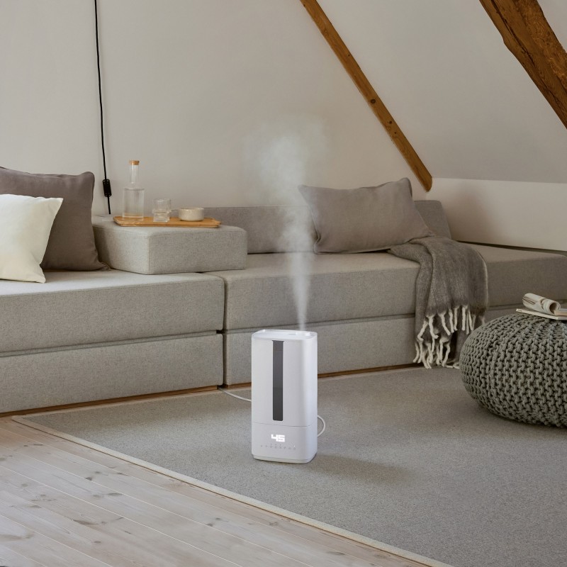 Oliver w kolorze białym to wydajny nawilżacz ultradźwiękowy, który szybko zwiększa wilgotność powietrza. Higienę zapewnia lampa UV, która przed nebulizacją naświetla wodę, eliminując 99,99% wszystkich bakterii. Zbiornik na wodę można łatwo napełnić podczas pracy: wystarczy otworzyć pokrywę u góry, wlać wodę i gotowe. Kilka kropli olejku eterycznego w zintegrowanym pojemniku na zapachy – i nawilżacz emituje również delikatny zapach. Żądana wilgotność może być elastycznie regulowana w zakresie od 30 do 75% za pomocą higrostatu. W trybie automatycznym wydajność nawilżania jest regulowana automatycznie – dla szybkiego osiągnięcia i utrzymania stałego poziomu wilgotności.
