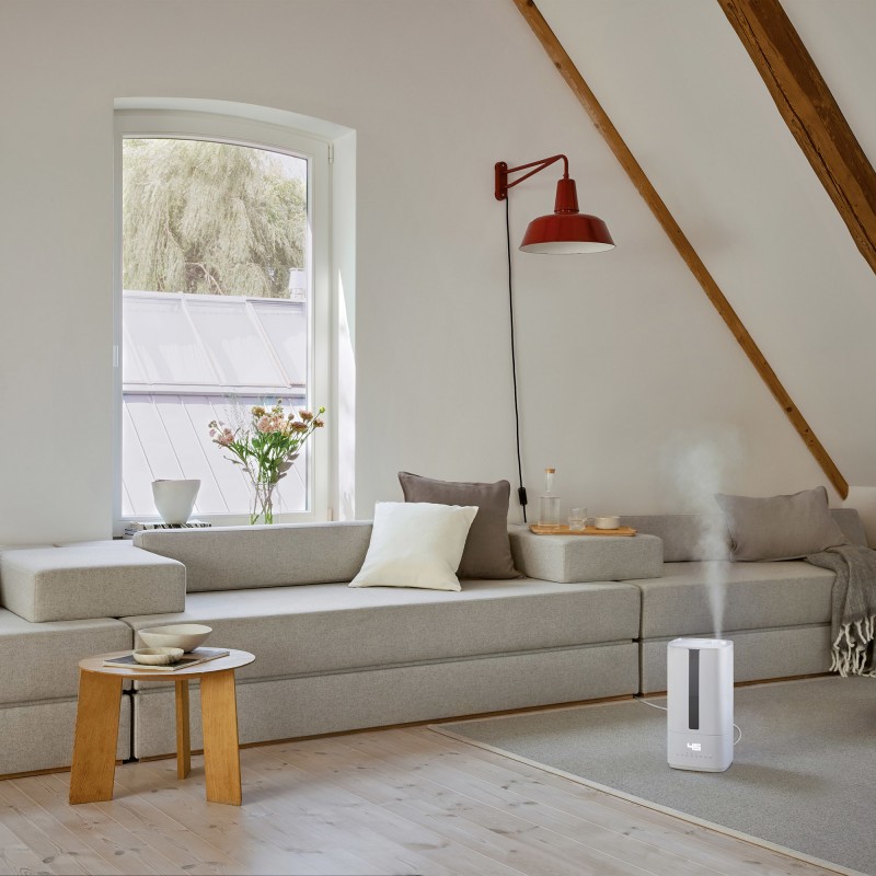 Dzięki zintegrowanej lampie UV woda jest higienicznie czysta przed rozpyleniem – eliminuje się 99,99% wszystkich bakterii, wirusów i grzybów. Zapewnia to higieniczne, przyjemne nawilżenie i ogólne dobre samopoczucie.