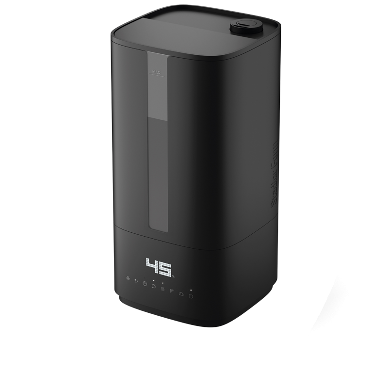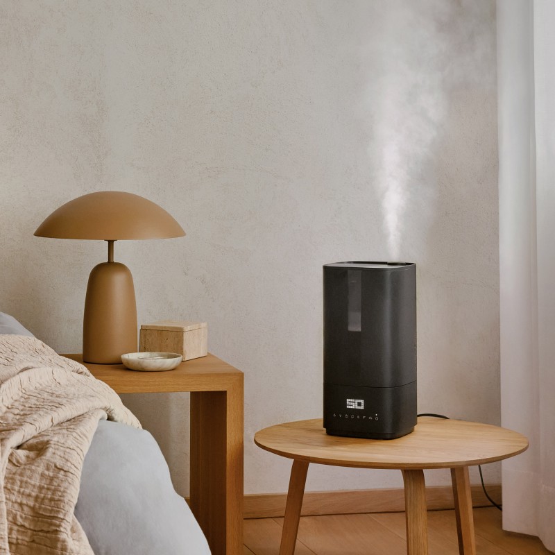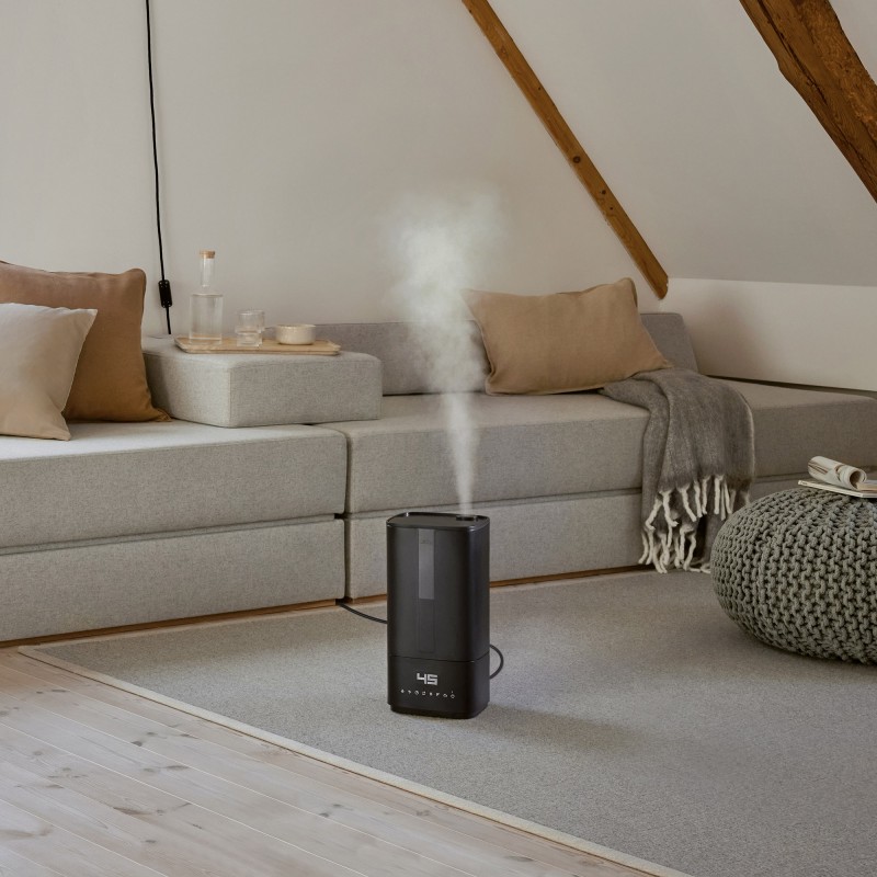 Oliver w kolorze czarnym to wydajny nawilżacz ultradźwiękowy, który szybko zwiększa wilgotność powietrza. Higienę zapewnia lampa UV, która przed nebulizacją naświetla wodę, eliminując 99,99% wszystkich bakterii. Zbiornik na wodę można łatwo napełnić podczas pracy: wystarczy otworzyć pokrywę u góry, wlać wodę i gotowe. Kilka kropli olejku eterycznego w zintegrowanym pojemniku na zapachy – i nawilżacz emituje również delikatny zapach. Żądana wilgotność może być elastycznie regulowana w zakresie od 30 do 75% za pomocą higrostatu. W trybie automatycznym wydajność nawilżania jest regulowana automatycznie – dla szybkiego osiągnięcia i utrzymania stałego poziomu wilgotności.